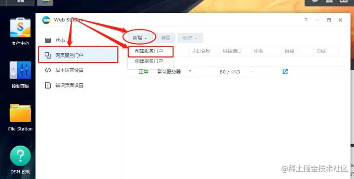 完成网页文件夹的移动后,我们就能对web station进行简单设置,使其生成本地网页运行的环境。点击web station图表下方的“打开”按钮,进入web station的主界面,我们点击左侧的“网页服务门户”项,点击页面上方的“新增”,在跳出的选择框中选择“创建服务门户”,生成一个网页运行容器。