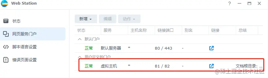 接着,在web station就会显示出我们创建的新的主机,也证明我们新建的静态网页设置成功。