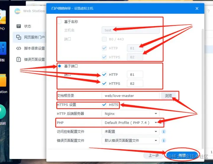 端口:去掉勾选80/443端口(80端口附加了很多web管理,为避免混淆,还是不要选它),勾选http并附加端口号81(群晖套件占用了大量端口,所以选个比较少用的);