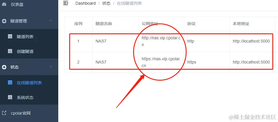 如上图所示,我们需要将之前勾选的“随机域名”更改为“二级子域名”,并在新出现的“Sub Domain”栏中,填入我们在cpolar云端保留的二级子域名(这个例子中,我们保留的是NAS)。在这些变更完成后,就可以点击下方的“更新”按钮,保存变更的配置。接着我们进入“在线隧道列表”页面,就可以看到访问内网群晖NAS的公共互联网地址,已经更新为带有自定义域名的地址。