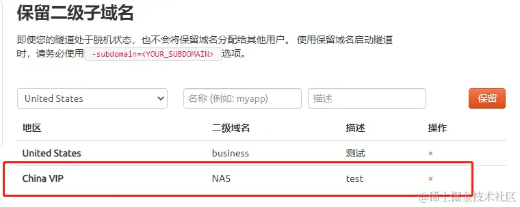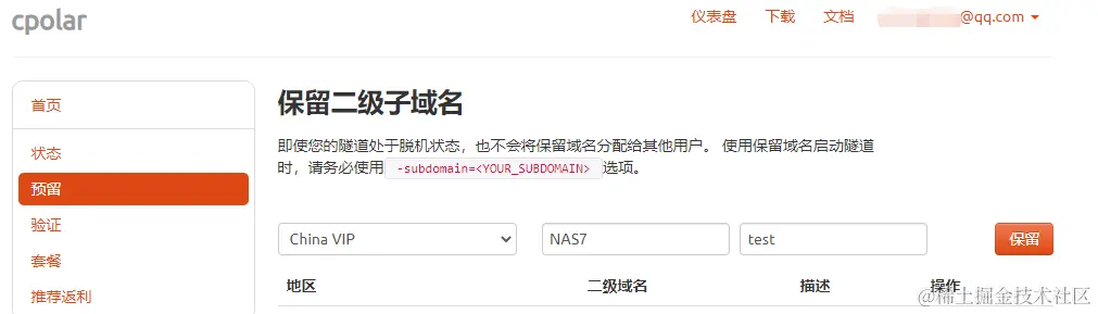 在“预留”界面,我们找到“保留二级子域名”栏位。在这里设置的,就是数据隧道的公共互联网入口端。与cpolar客户端的设置类似,我们也要在这里进行一些简单设置。首先是“地区”栏,只要按实际使用地区填写即可(这里我们填入China VIP);“名称”则是我们对数据隧道的命名,不过与cpolar客户端不同,这里的名称会编入最终生成的URL中(这里我们选择填入NAS);而最后的“备注”,这是这条数据隧道的提示,这里我们填入test。