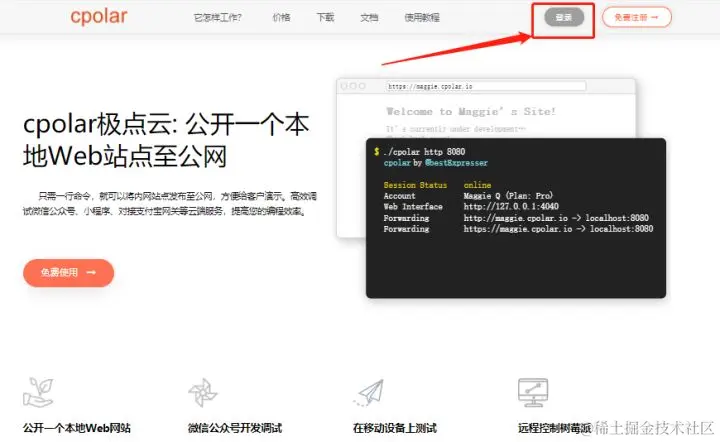 要创建一条固定数据隧道,我们需要从隧道的进口端和出口端两个方面,将漂移的端口固定下来。首先我们转到cpolar官网
