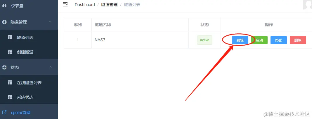 接着我们转回cpolar客户端,在客户端“隧道管理”项下的“隧道列表”页面,重新编辑我们之前建立的临时数据隧道,将cpolar云端数据隧道的入口,与cpolar本地端数据隧道的出口关联起来,这样我们才能使用重定义的数据隧道,访问位于内网的群晖NAS。