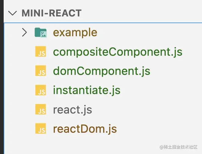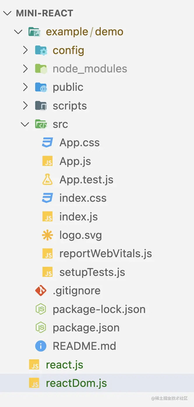 在根目录补充react.js和reactDom.js,其中reactDom.js给一个render的实现: