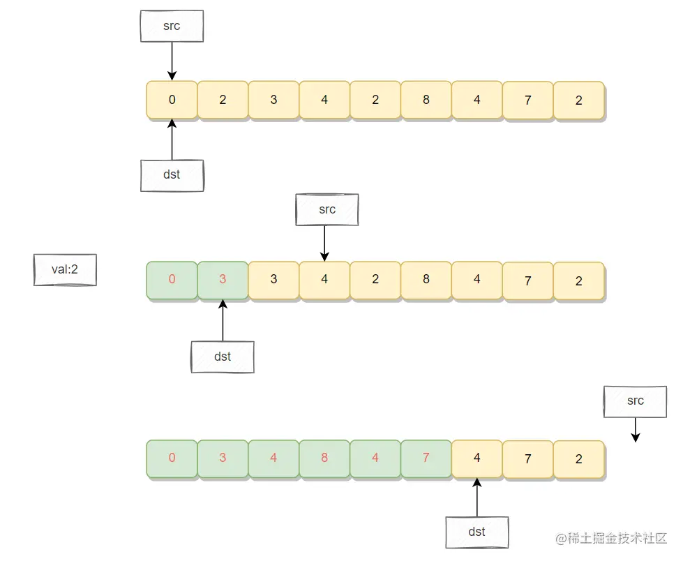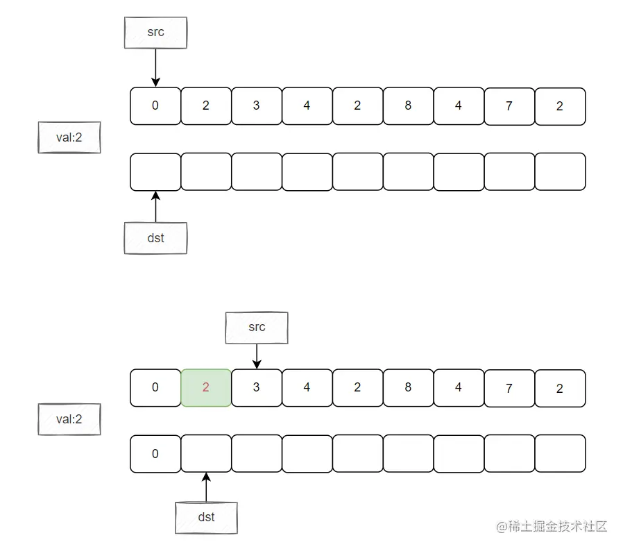 定义两个下标src和dst,欸你这也不是指针啊,是不是骗人?非也,用数组下标在逻辑思路上和使用指针没什么区别。src遍历数组,dst用来“封口”,也就是用src检测元素是不是val,不是的话就不用移除,那就把它放在dst管理的子数组中,然后dst自增1,看起来是不是就像src在装载货物到袋子中?dst就是袋口,装到最后没东西装了就装完了,dst就用来“封口”了。