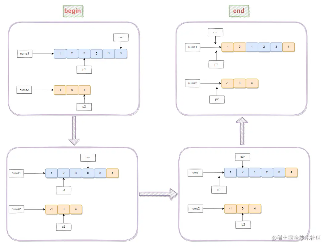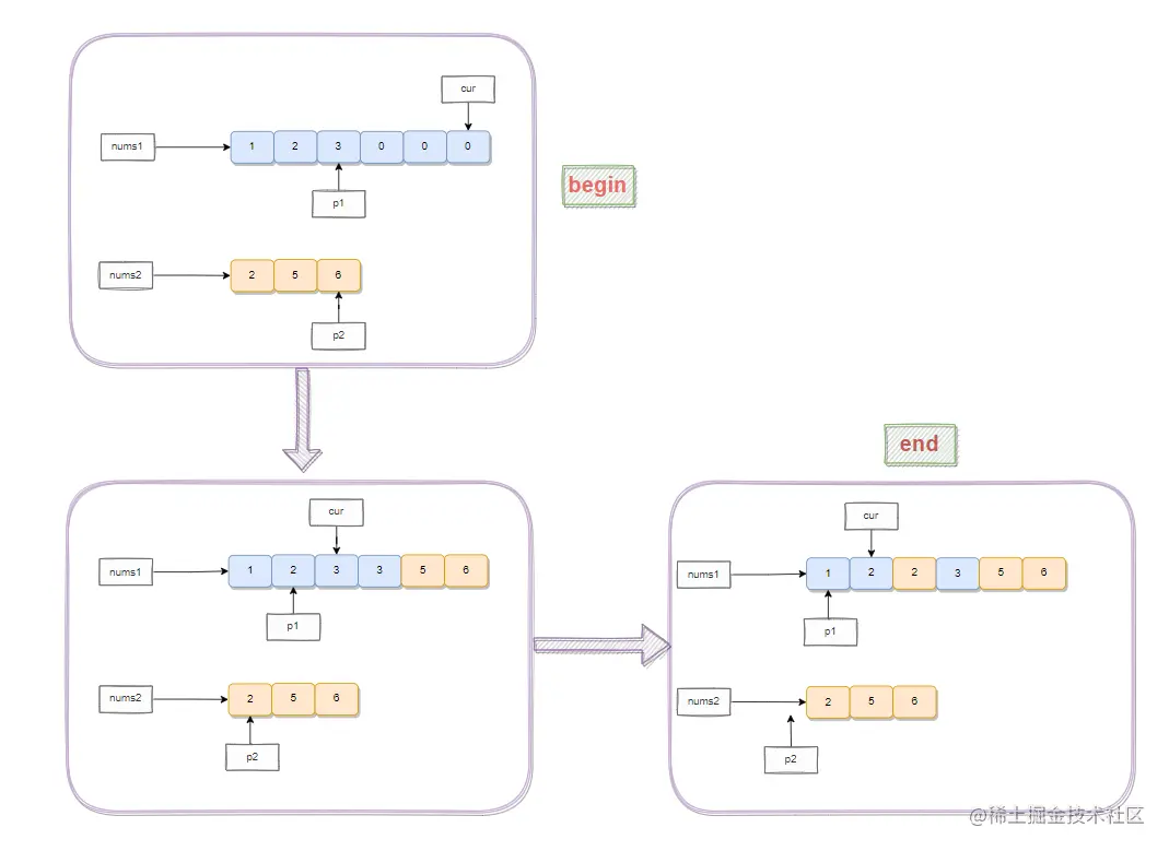 定义两个下标p1和p2,分别对应数组nums1和nums2,再定义一个下标cur从nums1的末尾开始,每放入一个元素就向前移动一位,而p1和p2从两个数组最后面的有效元素开始,向前移动,比较两个数组的元素的大小,注意啦,这里是要把大的那个拿出来放到cur指向的位置。