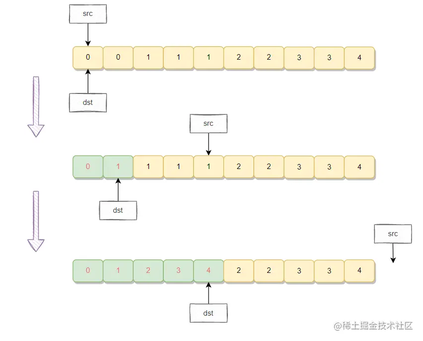 实际上和上一道题思路十分的类似,还是定义两个下标,src对应原数组,dst对应子数组,还是遍历一遍数组,不过这一题的判断条件要改改——判断src遇到的元素是否和dst对应的元素相同,相同的不要,直接跳过,遇到不同的才放入dst管理的子数组,直到src把原数组访问完毕。不过要注意的是,src遇到不同的元素时,要先让dst自增1再把nums[src]赋值给nums[dst],dst直接指向的是子数组的最后一个元素(这和上一题不一样),所以最后返回值时要让dst加个1。
