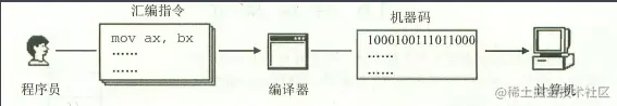 可能有人会问,我们用汇编语言编写程序,可是计算机只认识机器指令,那该怎么办?这时候就需要一个能将汇编语言转换成机器指令的工具,我们称其为编译器。程序员用汇编语言写出源代码,再用汇编编译器将其编译为机器码,最后由计算机执行。