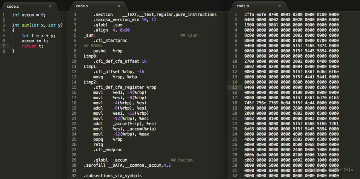 而这篇博客我们将讲解汇编和机器代码的关系。首先下面一张图是C语言、汇编语言以及翻译过的机器语言,大家可以先有个大概的眼熟。