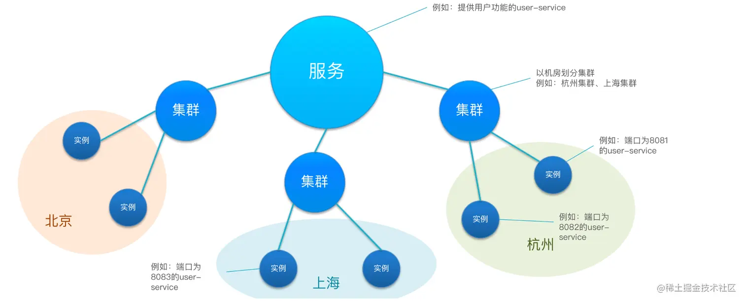 - 三级是实例,例如杭州机房的某台部署了userservice的服务器