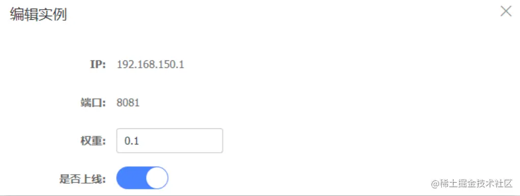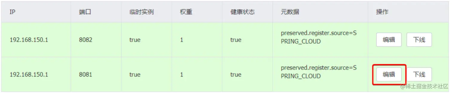 在Nacos控制台可以设置实例的权重值,首先选中实例后面的编辑按钮