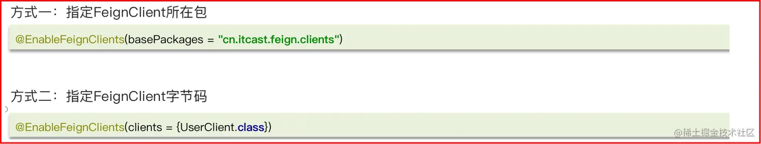 当定义的FeignClient不在SpringBootApplication的扫描包范围时,这些FeignClient无法使用。有两种方式解决: