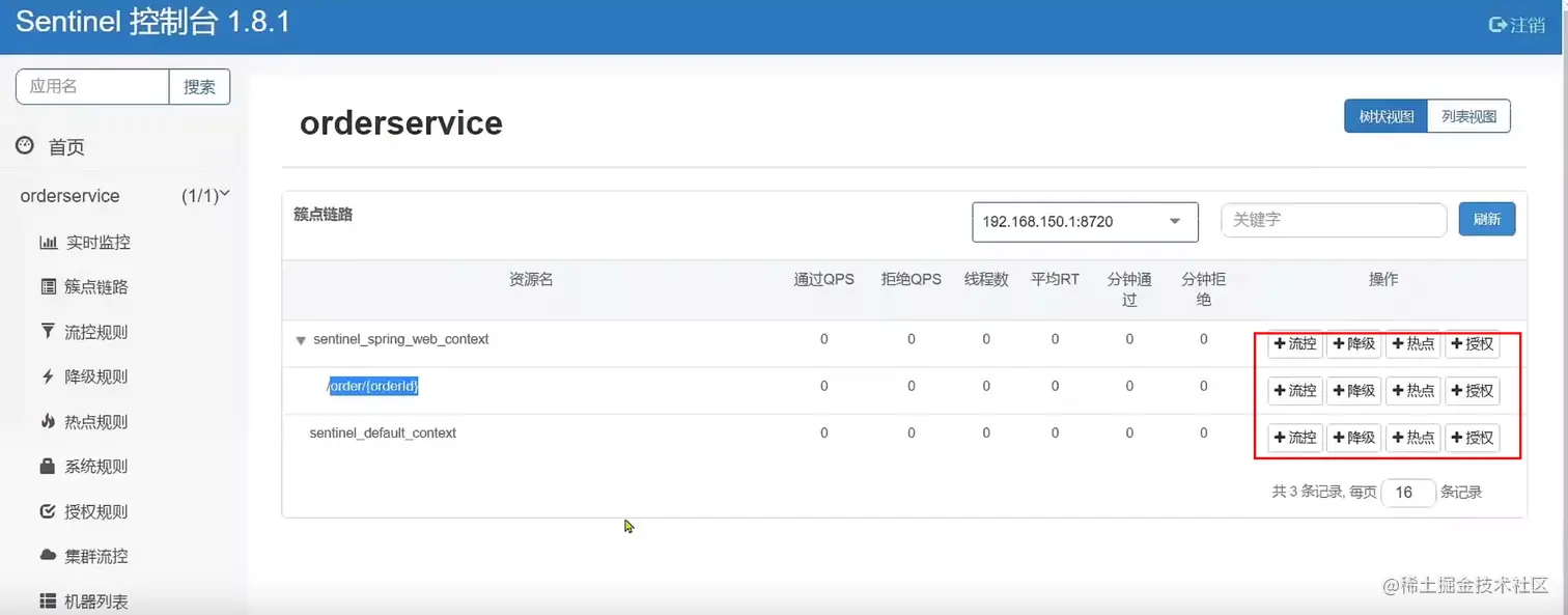 流控、熔断等都是针对簇点链路中的资源来设置的,因此我们可以点击对应资源后面的按钮来设置规则: