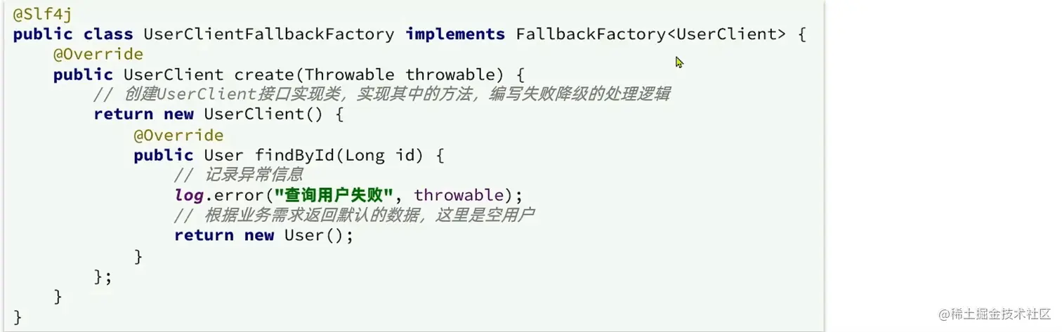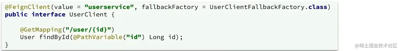 步骤三:在feing-api项目中的UserClient接口中使用UserClientFallbackFactory:
