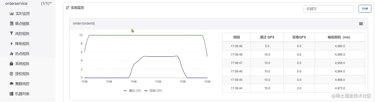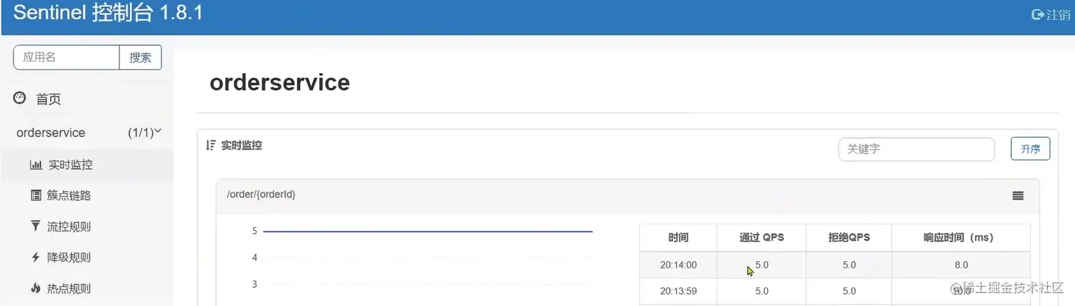 其含义是限制 /order/{orderId}这个资源的单机QPS为5,即每秒只允许5次请求,超出的请求会被拦截并报错。