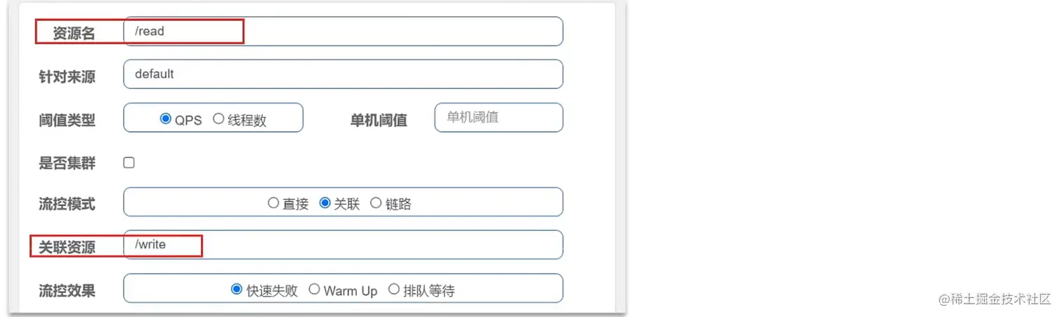 当/write资源访问量触发阈值时,就会对/read资源限流,避免影响/write资源。