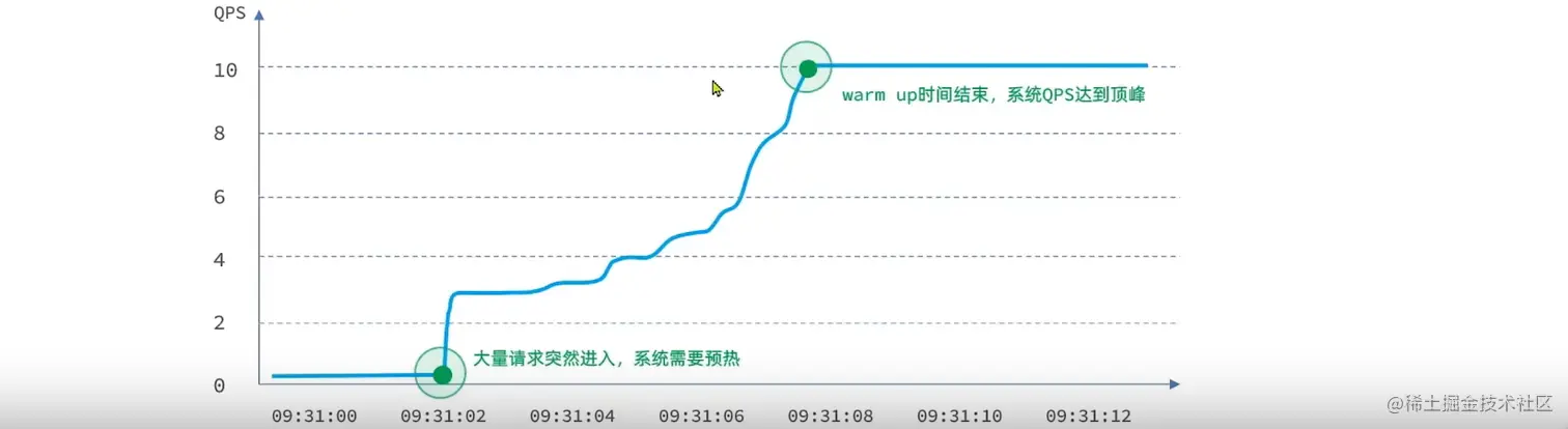 warm up也叫预热模式,是应对服务冷启动的一种方案。请求阈值初始值是 threshold / coldFactor,持续指定时长后,逐渐提高到threshold值。而coldFactor的默认值是3。