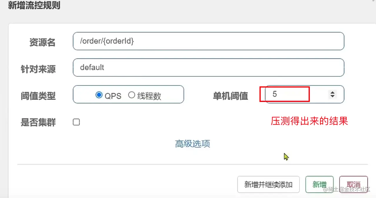 点击资源/order/{orderId}后面的流控按钮,就可以弹出表单。表单中可以添加流控规则,如下图所示:
