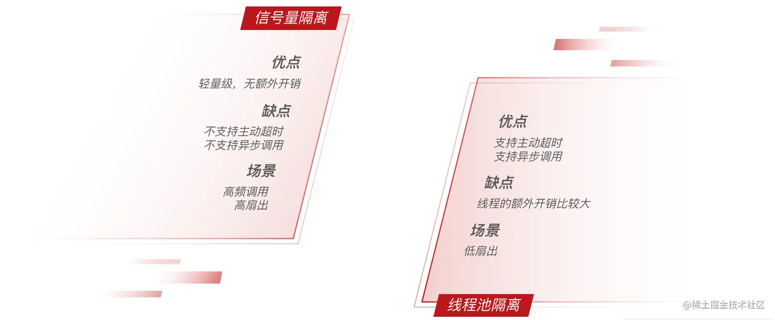 | 隔离策略 | 信号量隔离 | 线程池隔离/信号量隔离 |