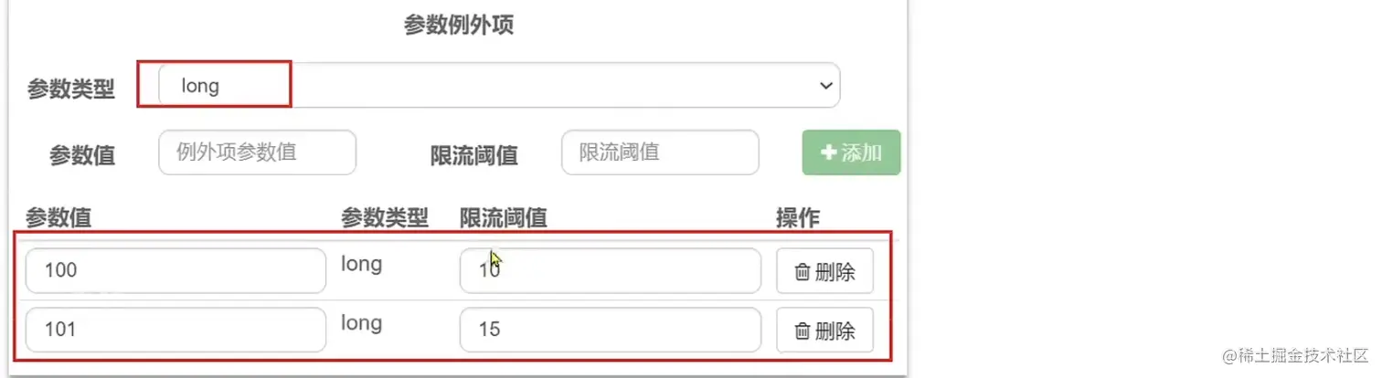 在热点参数限流的高级选项中,可以对部分参数设置例外配置: