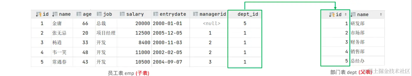 注意:目前上述的两张表,在数据库层面,并未建立外键关联,所以是无法保证数据的一致性和完整性的。