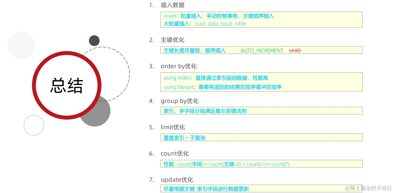按照效率排序的话,count(字段) < count(主键 id) < count(1) ≈ count( ),所以尽量使用 count( )(数据库专门做了优化)。