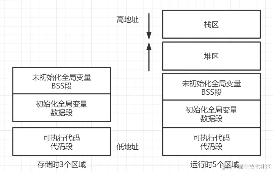 BSS段(Block Started bySymbol以符号开始的块,BSS是Linux 链接器产生的未初始化数据段),未初试化的全局变量和静态变量的区域,只记录需要的内存大小并不实际存放数据,同样结束由OS释放。