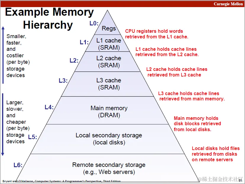 上面说的,这些编译好的数据保存在我们的电脑上,具体在我们的计算机哪里,我们需要了解计算机有哪些存储器,存储器系统(memory system)是一个需要考虑多元因素存储设备的层次结构,例如容量、成本和访问时间。