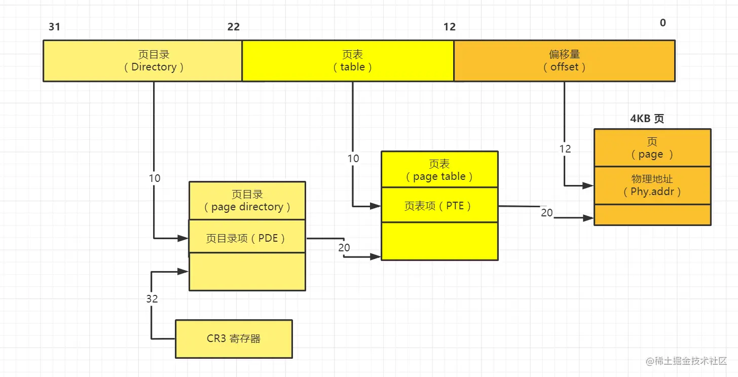 如段描述符表的起始地址被保存在GDTR中一样,页目录表的地址也被保存在CR3 寄存中。线性地址的查询页表基地址的 DIR 部分为10位,Table用于查询页表项的部分为10位,用于查找物理页框偏移量部分为12位。