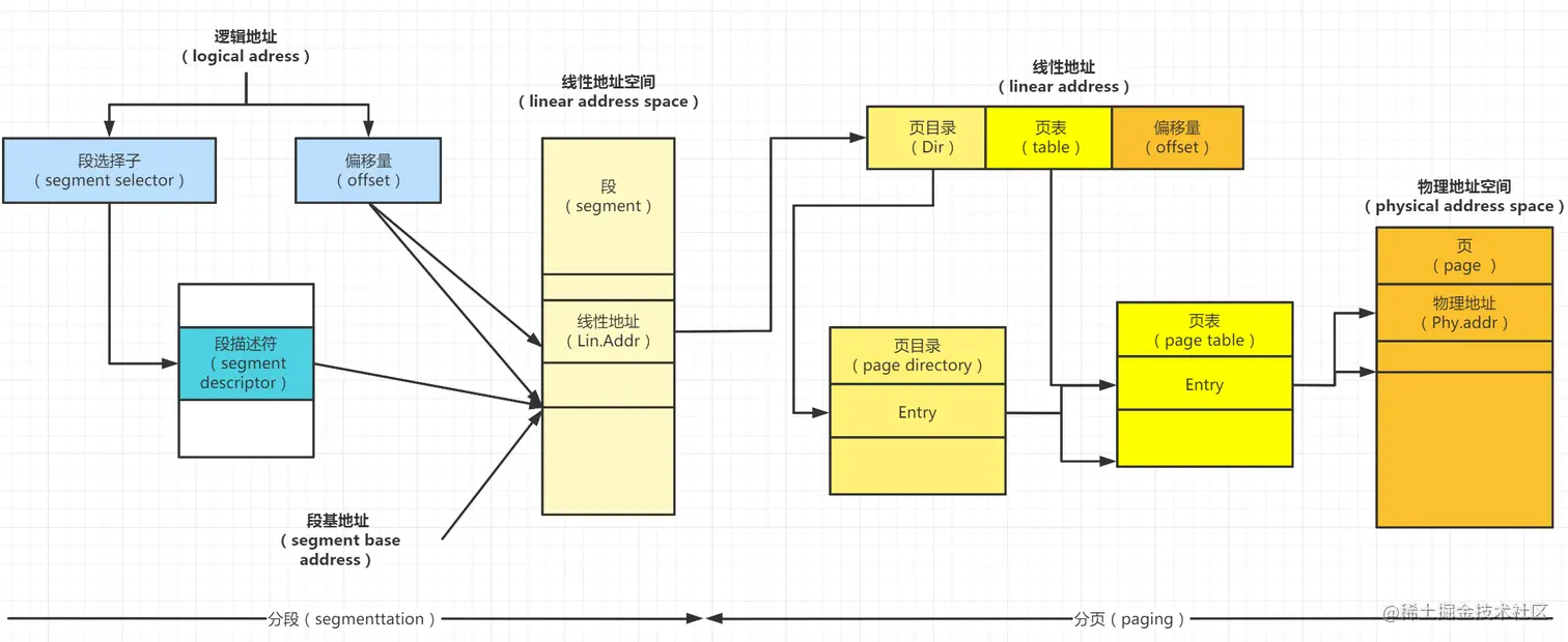 从上图中可以看到,开启分页后的 intel 寻址分为两步: