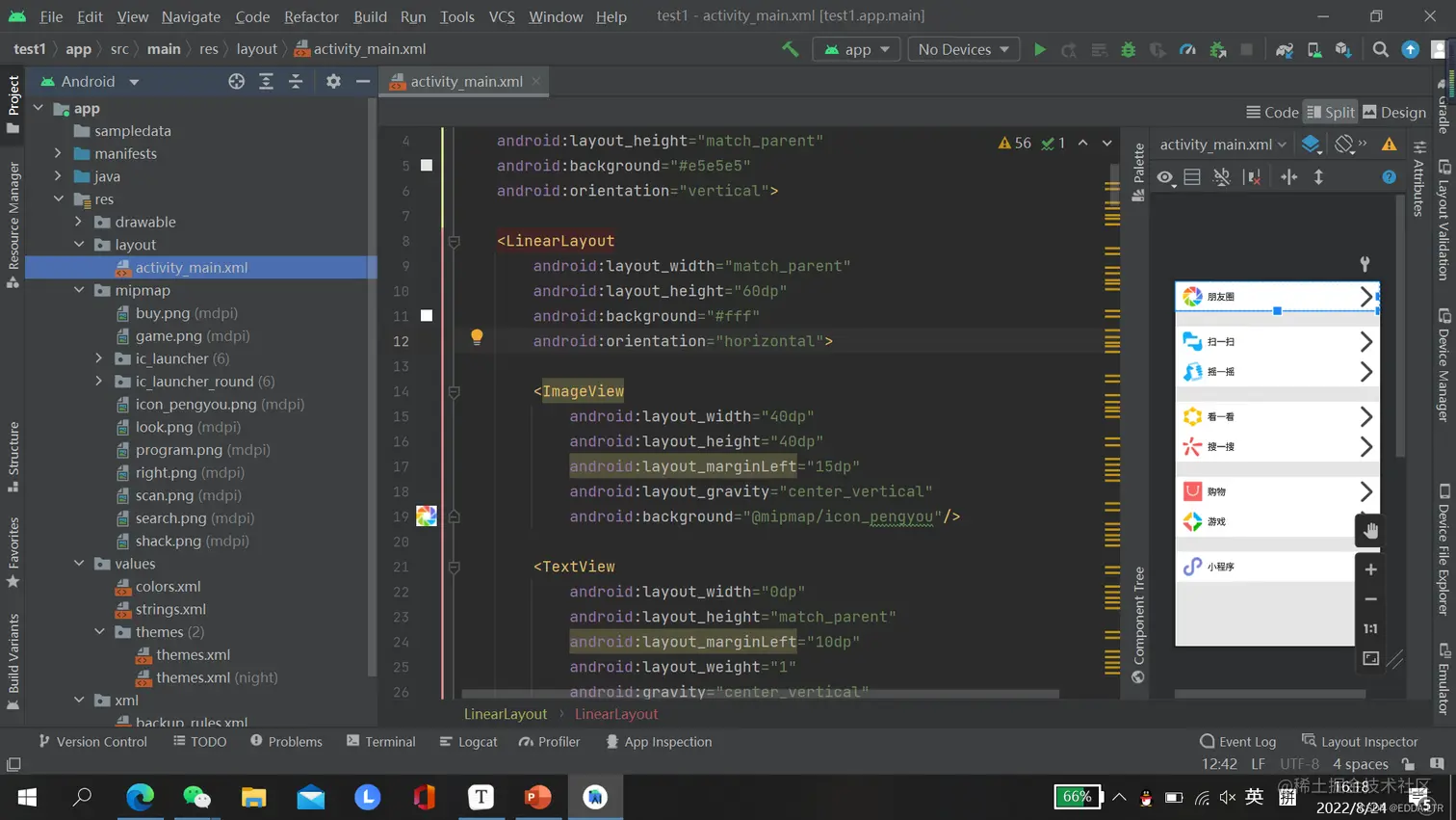 在 app/res/layout/activity_main.xml 文件中编写页面。
