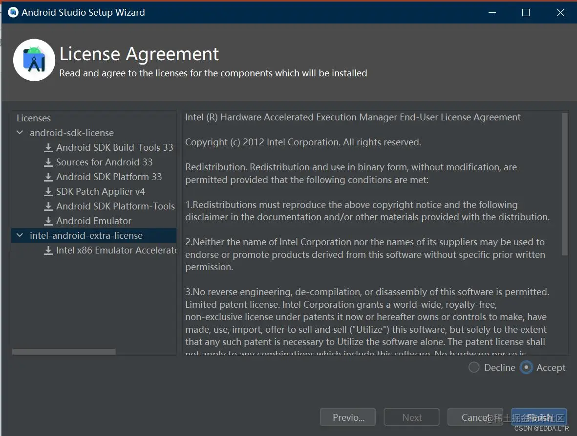 一个关于 SDK 的协议,选择 Accept,然后选择 Finish 。