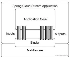 一个 Spring Cloud Stream应用程序由一个中立的中间件核心组成。应用通过 Spring Cloud Stream注入的输入和输出 通道与外部世界通信。通道通过专用的 Binder实现与外部代理连接。