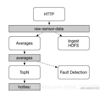 传感器上传到HTTP端点的数据被发送到名为 raw-sensor-data的通用destination。两个微服务从这个destination中接收到数据, 一个微服务应用(Averages)独立地处理数据并计算平均时窗,另外一个微服务应用(Ingest HDFS)将原始数据读入HDFS。为了处理数据,两个应用都在运行时指定这个主题为它们的输入。 发布-订阅通信模型降低了生产者和消费者之间的复杂性,并允许添加新的应用到拓扑中而不破坏已有的流程。例如,在"Averages"应用程序的下游,添加一个计算用于展示和监控的最高温度值的应用。然后可以添加另一个应用程序来解释相同的平均流量以进行故障检测。通过共享的主体而不是点对点的队列来通信降低了微服务之间的耦合性。 发布-订阅消息的概念并不新潮, Spring Cloud Stream采取额外的步骤,使其成为应用程序模型的自由选项。通过支持使用本地中间件, Spring Cloud Stream也简化了在不同的平台上发布-订阅模型的使用。