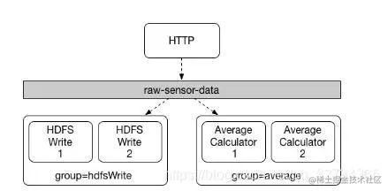 虽然发布-订阅模型使得通过共享主题来连接应用更加简单容易,但通过创建给定应用的多个实例来进行扩展的能力同样重要。当这样做的时候,一个应用程序的不同实例被放置在竞争的消费者关系中,对于给定的消息,只有一个实例会接收并进行处理。 Spring Cloud Stream通过消费者组的概念来模拟这种行为。( Spring Cloud Stream消费者组与Kafka的消费者组相似,并收到它的启发)每个消费者绑定可以使用 spring.cloud.stream.bindings.<channelname>.group</channelname>属性来指定一个组名。下图中显示的是多个此属性被设置为 spring.cloud.stream.bindings.<channelname>.group=hdfsWrite</channelname>或者 spring.cloud.stream.bindings.<channelname>.group=average</channelname>的消费者。