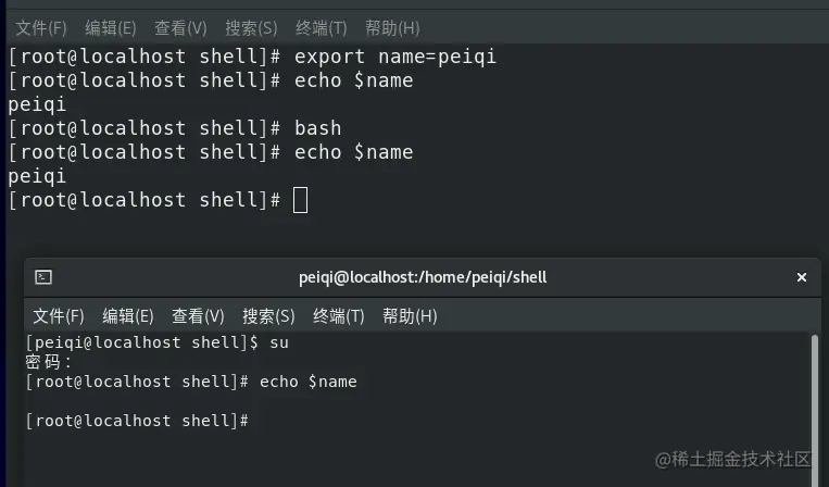 用于设置临时环境变量,对子shell进程有效,对其它shell进程无效