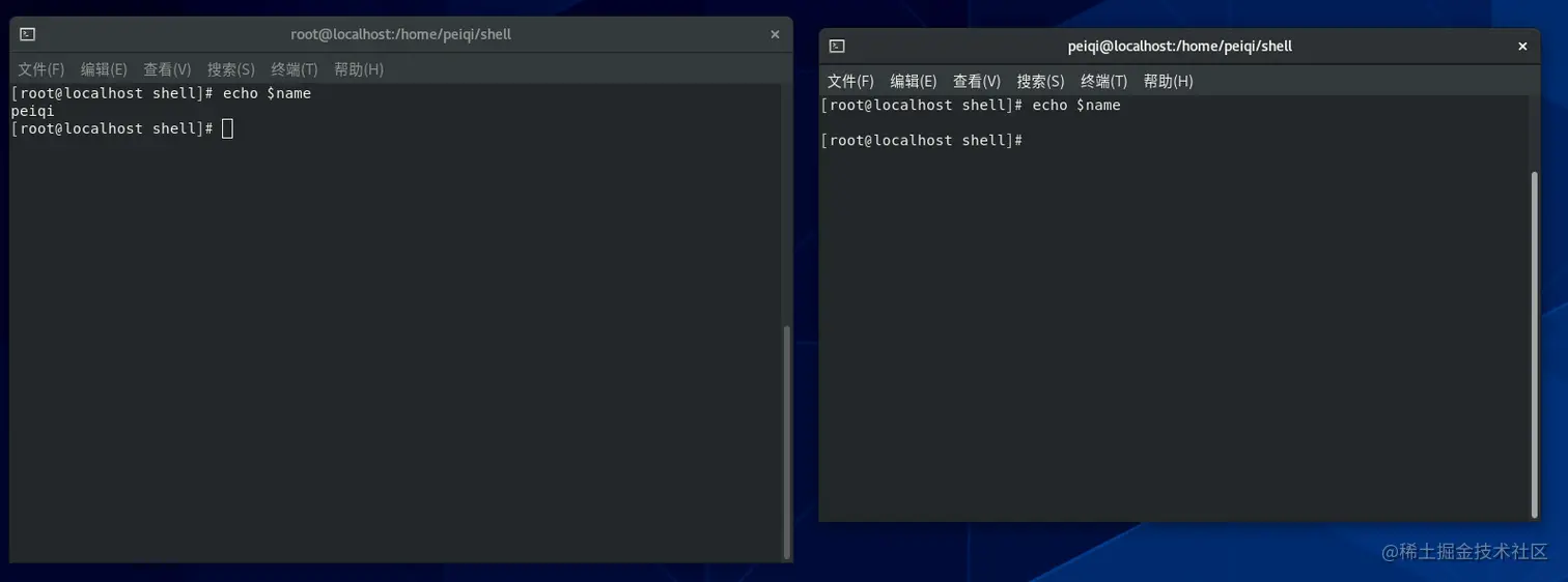 在shell脚本中定义一些临时变量时使用,对当前shell进程的子shell进程及其它shell进程无效