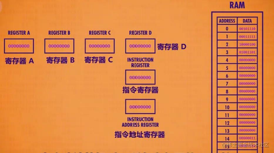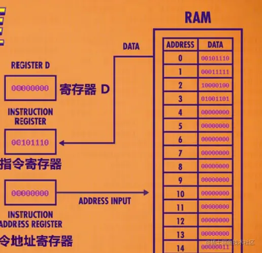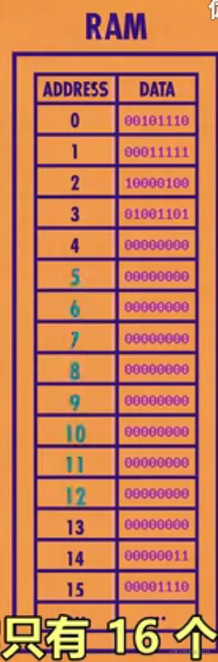 在之前我们拿出RAM,可以看到每个地址都存储着8位数字,前四位代表的就是操作码,后四位代表的是地址OR寄存器 .