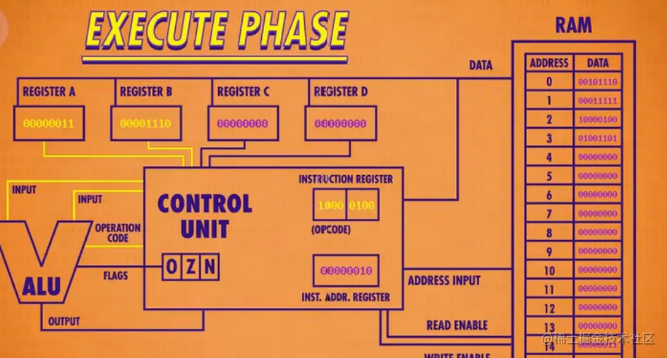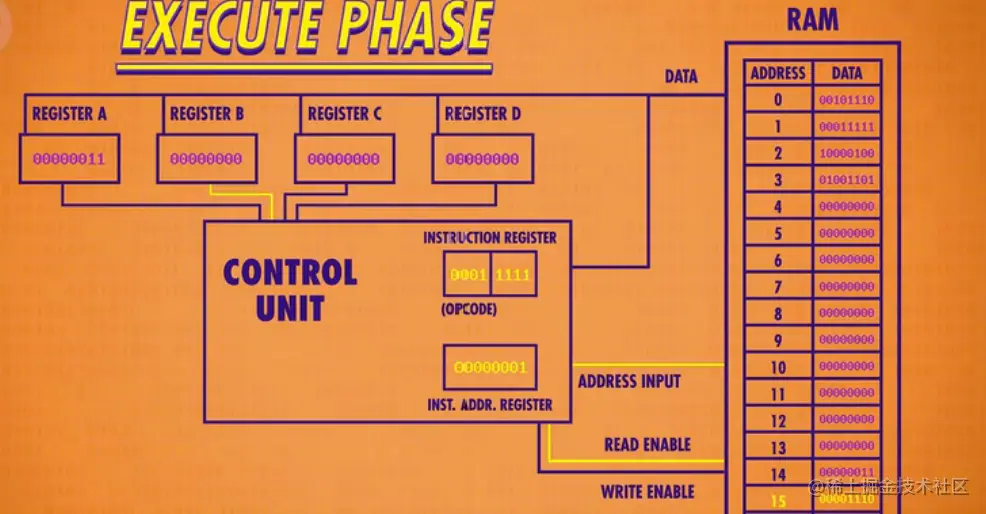 指令寄存器拿到数据DATA后通过控制单元进行解码,现在我们知道了这个是LOADA指令,就可以进行执行阶段了