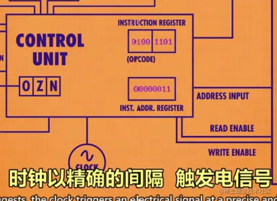 时钟以精确的间隔,触发电信号,控制单元用这个信号,推进CPU的内部操作,确保一切按顺序执行。时钟不能太快,因为就算是电也要有一定时间来传输