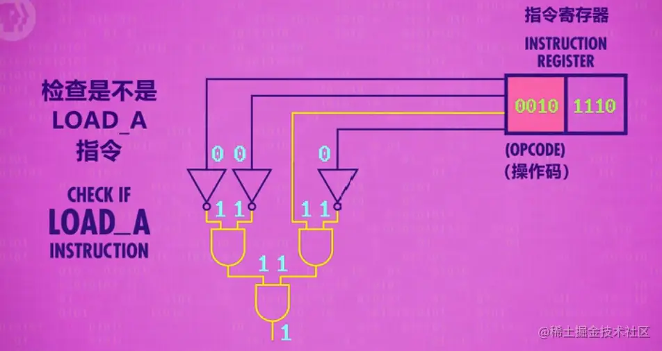 针对不同的操作码有对应的指令判断电路从而执行不同的操作。例如下面这个就是检查操作码是不是LOADA(0010)指令。