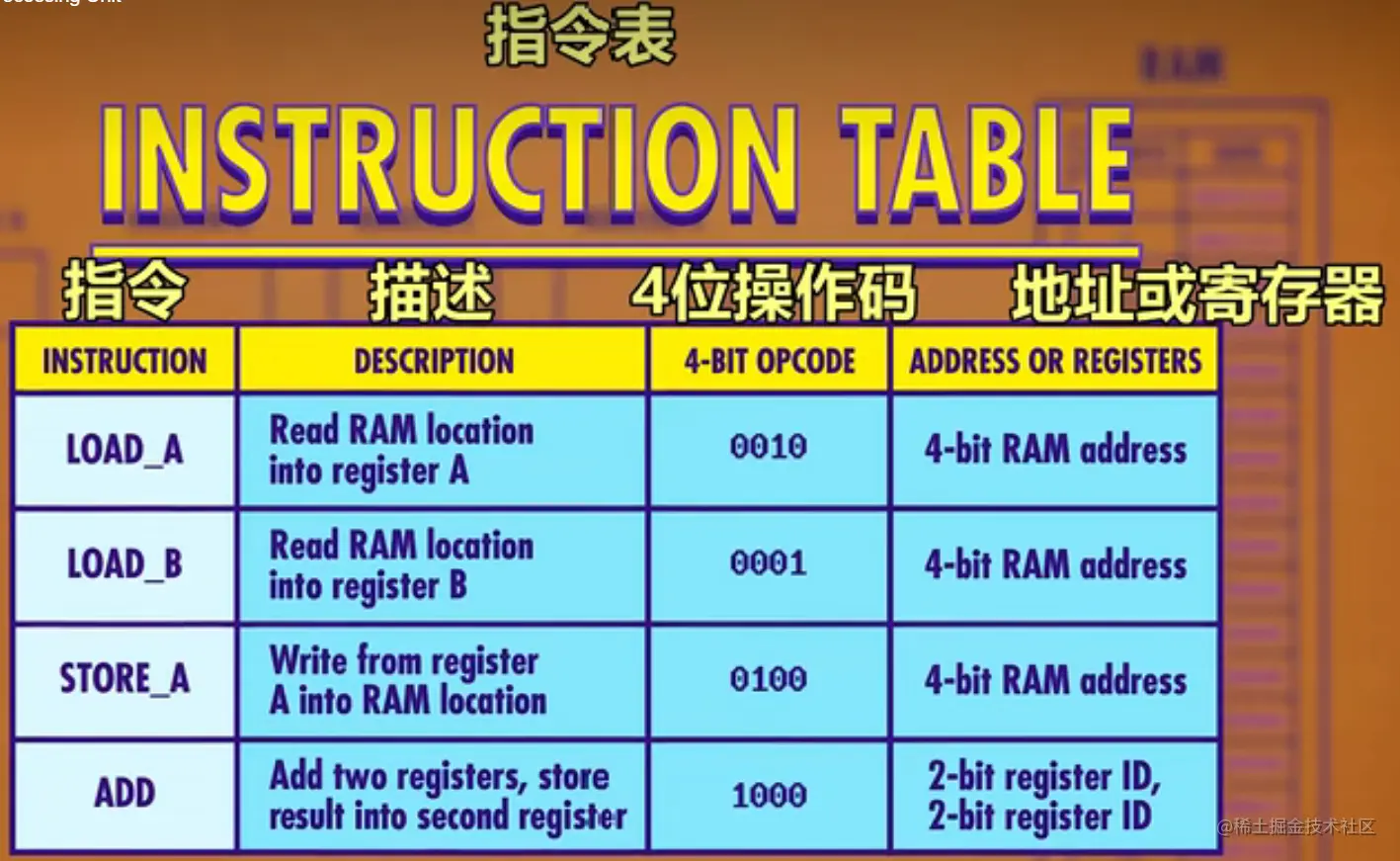 ADDRESS OR REGISTERS(地址OR 寄存器):也是4位,表示的是操作码需要使用的地址或者寄存器(比如加载一个内存里的值放入寄存器中就需要指定打开的是哪个内存地址)