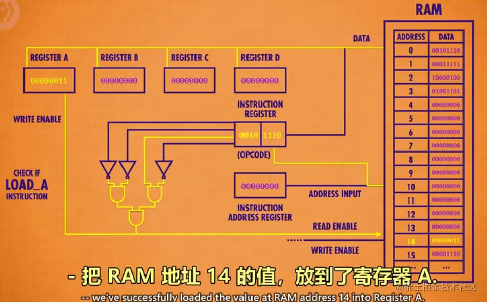 2.读取RAM 对应地址的值:RAM拿到地址14上的值,0000 0001也就是十进制的三