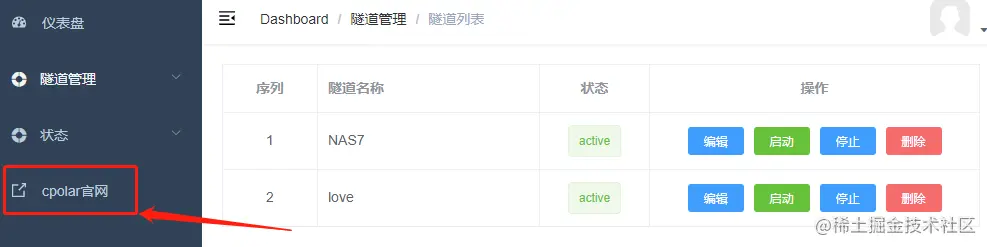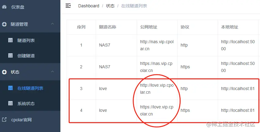 接着我们再转入“状态”项下的“在线隧道列表”页面,查看公网地址信息是否更改成功
