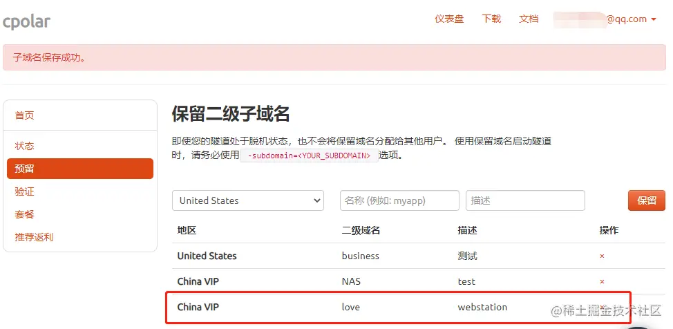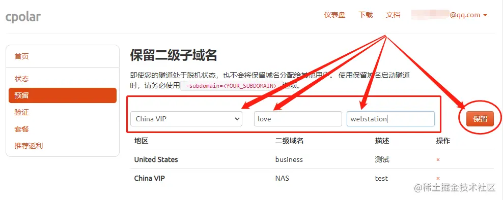 进入cpolar官网并登录个人账号后,我们点击页面左侧的“预留”项,找到“保留二级子域名”栏位。在这个栏位中,我们需要对三项信息进行定义。首先是“地区”,该栏与cpolar客户端一样,选择实际使用地区即可(这里我们填入China VIP);接着是“名称”栏位,这个栏位填入的信息最终会显示在公网地址中,因此可以选择清晰明了的内容(我们填入网页内容love);最后是这条数据隧道的描述,也可以看做注释,方便我们区分不同数据隧道所指向的内容。