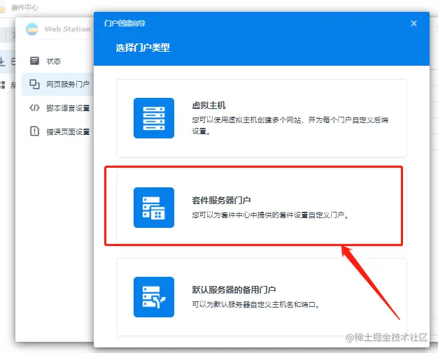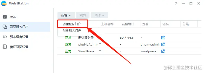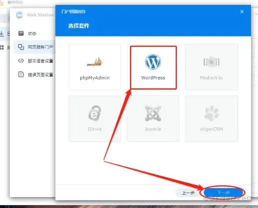 由于我们是直接在群晖套件中心中安装的WordPress,因此并不需要如之前的love网站一样,选择网站文件存放的位置,而可以直接以“套件服务器门户”方式,让web station自行搜索WordPress的文件夹位置。