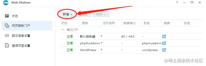 在群晖系统中打开web station套件,在套件的主界面,找到“新增”按钮。