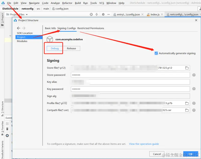 首先把自己的手机连接到电脑上,打开开发人员选项–> 开启USB调试–>同意调试 然后打开DevEco Studio的file–Project Structure–Project–Signing Configs–automatically generate signing 如下图: