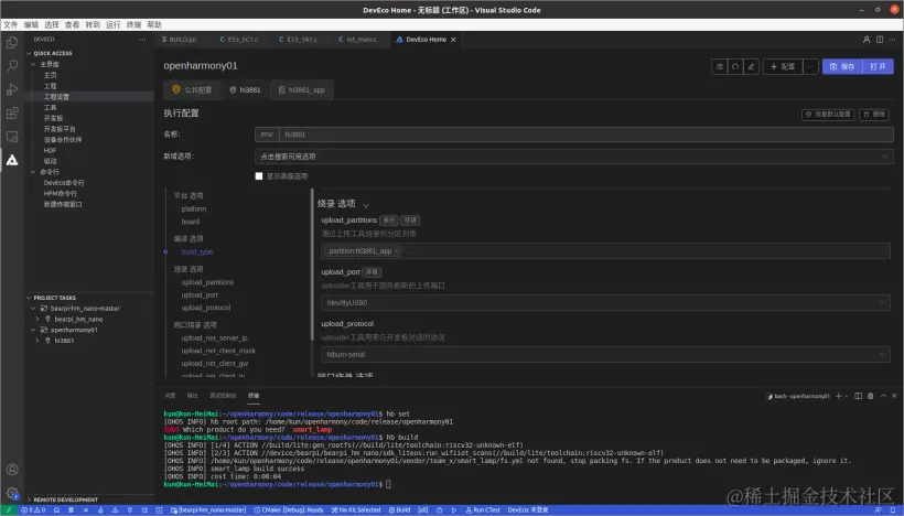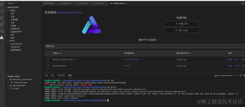打开Visual Studio Code下的DevEco Device Tools,导入1.0.1工程选择对应的开发板即可。打开终端,cd到源码路径,执行hb set,选择smart_lamp,然后执行hb build 编译。