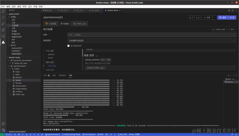 然后将第五步生成的Hi3861_wifiiot_app_allinone.bin拷贝到~/openharmony1.01/out/hispark_pegasus/wifiiot_hispark_pegasus下【因为工具默认下载该路径下的bin文件】 点击Project Task下的upload,按下板子上的复位即可烧录。
